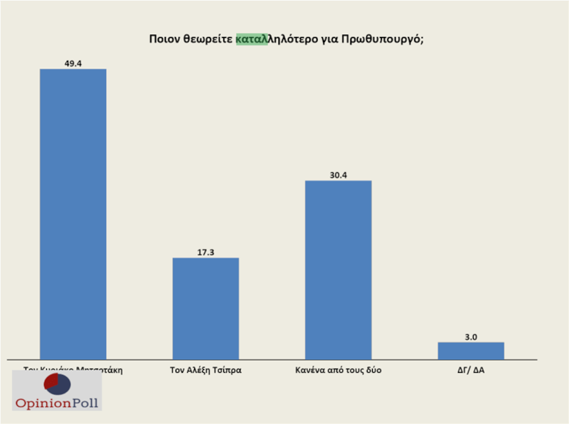 Παράλληλα, ο Κυριάκος Μητσοτάκης προηγείται κατά 32,1 μονάδες όσον αφορά την καταλληλότητα για πρωθυπουργός, συγκεντρώνοντας το 49,4% (από 52,7% τον Σεπτέμβριο), έναντι 17,3% του Αλέξη Τσίπρα (από 19,4% τον Σεπτέμβριο).