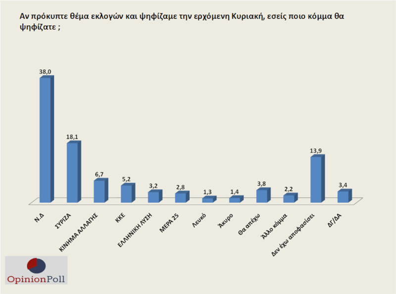 Στη νέα δημοσκόπηση της Opinion Poll καταγράφεται ξανά μεγάλη διαφορά από τον ΣΥΡΙΖΑ