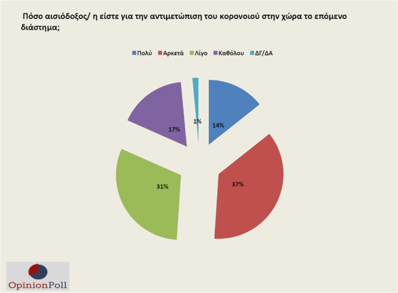 Σε ερώτημα του γκάλοπ «πόσο αισιόδοξος είστε για την αντιμετώπιση του κορονοϊού στη χώρα;», διακρίνεται μία επιφύλαξη, με το 14% να απαντά «πολύ» και το 37% «αρκετά», ενώ το 31% απαντά «λίγο». Πάντως το 67% δηλώνει ικανοποιημένο από τον τρόπο που έχει χειριστεί την πανδημία συνολικά η κυβέρνηση (70% τον Σεπτέμβριο).
