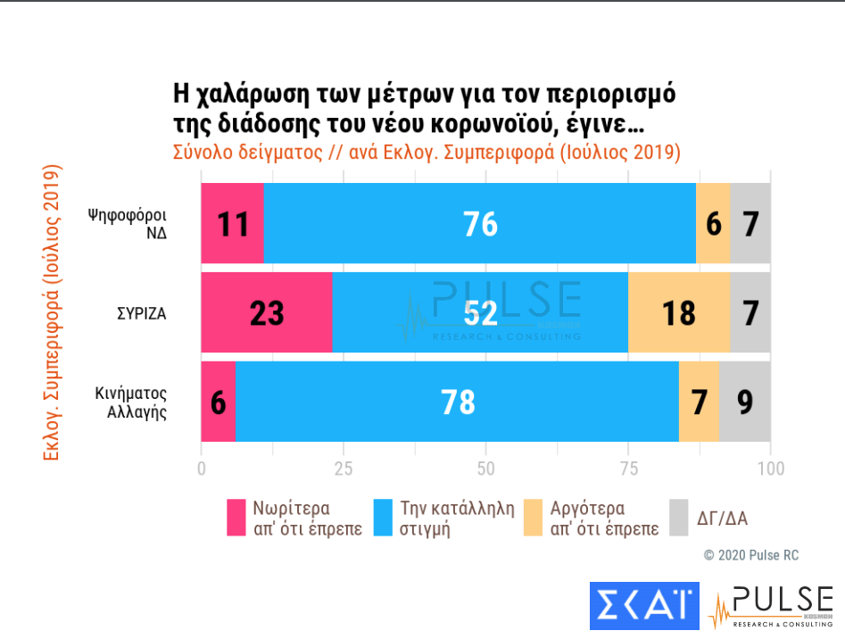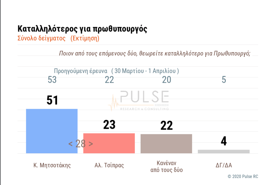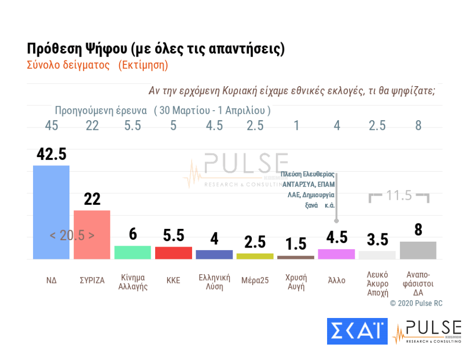 Share Facebook Twitter LinkedIn Pinterest Email Η πανελλαδική δημοσκόπηση της Pulse για λογαριασμό του ΣΚΑΪ δίνει στη Νέα Δημοκρατία προβάδισμα 20,5 ποσοστιαίες μονάδες έναντι του ΣΥΡΙΖΑ. ΔΕΙΤΕ ΣΕ ΓΡΑΦΗΜΑΤΑ ΟΛΑ ΤΑ ΕΡΩΤΗΜΑΤΑ ΚΑΙ ΤΑ ΠΟΣΟΣΤΑ ΤΩΝ ΑΠΑΝΤΗΣΕΩΝ: δημοσκόπηση Νέα Δημοκρατία ΣΥΡΙΖΑ