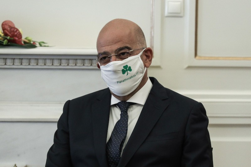 Στο Μέγαρο Μαξίμου και φορώντας μία μάσκα του Παναθηναϊκού, ο υπουργός Εξωτερικών Νίκος Δένδιας, υποδέχτηκε την Ισπανίδα ομόλογό του.