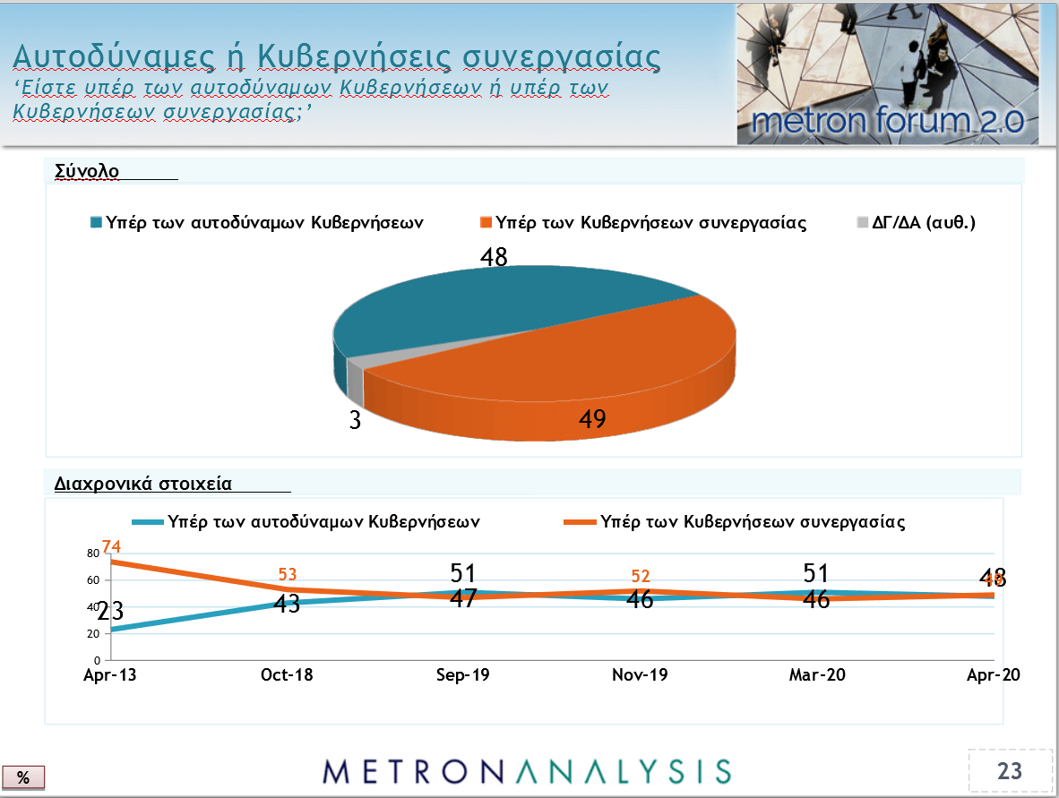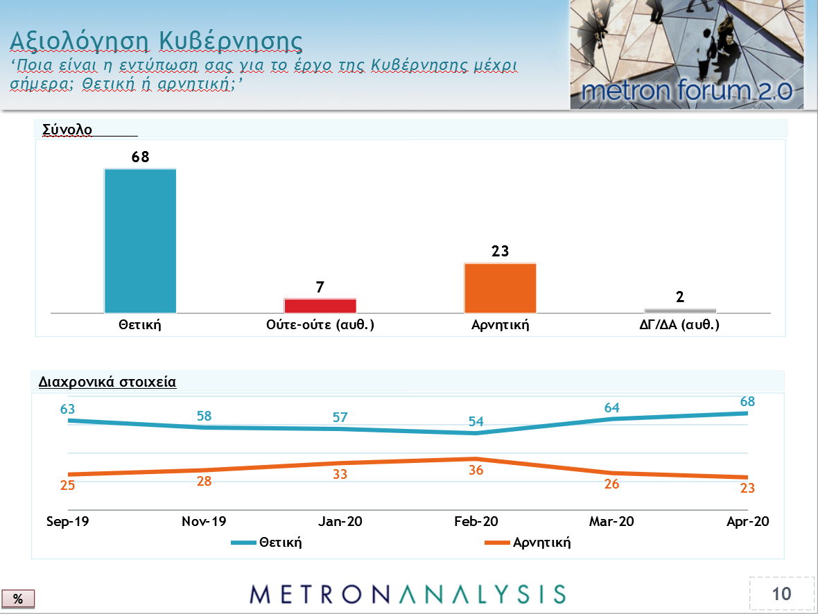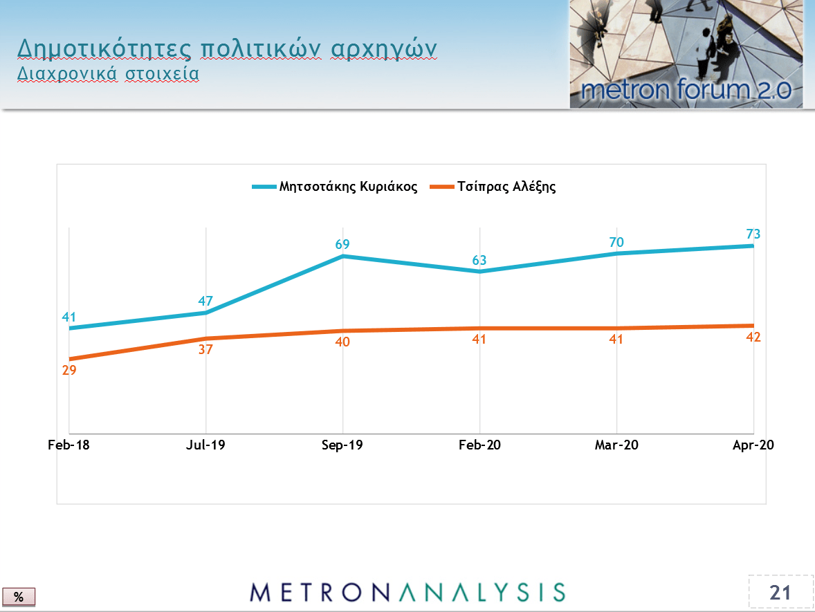 Με διπλάσιο ποσοστό και διαφορά 21,1% προηγείται η ΝΔ από τον ΣΥΡΙΖΑ όπως δείχνει δημοσκόπηση της Metron Analysis για το δελτίο του Mega, η οποία διενεργήθηκε εν μέσω της πανδημίας του κορονοϊού.