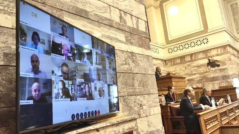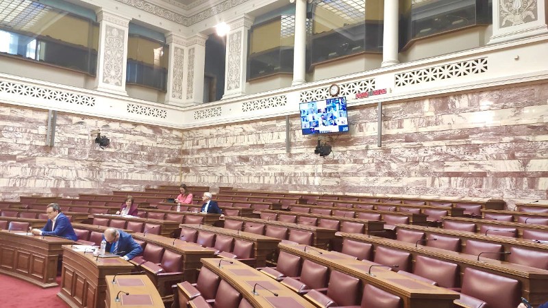 Στην αίθουσα της επιτροπής έχουν τοποθετηθεί οθόνες προκειμένου οι βουλευτές να βλέπουν και να ακούνε τους φορείς που τοποθετούνται.