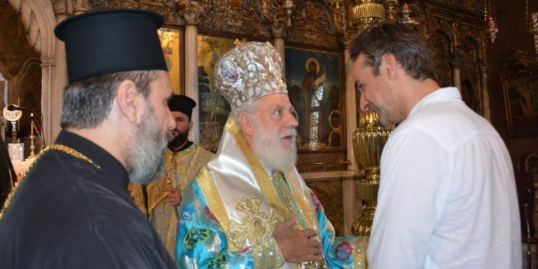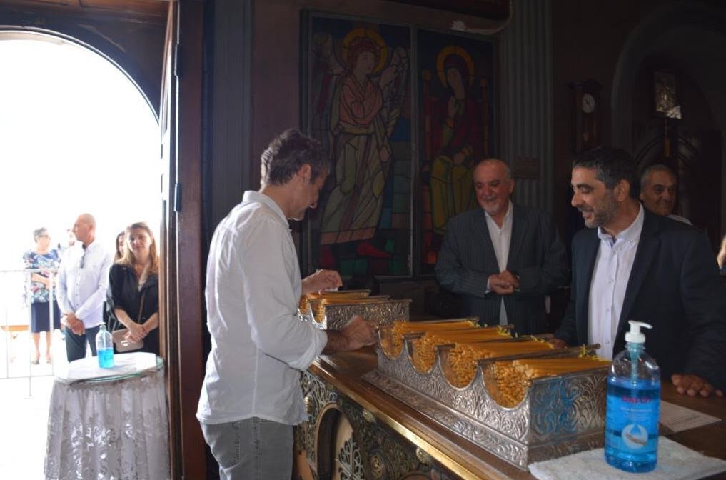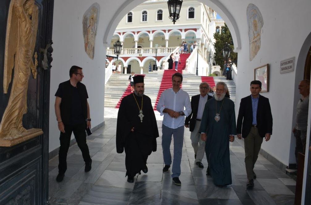 «Σας παρακαλώ κ. Πρόεδρε να προσκυνήσετε την Eικόνα (Αγίων Κωνσταντίνου και Ελένης), την οποία αφιέρωσε στο Ναό της Παναγίας ο πατέρα σας και προσωπικός μου ευεργέτης Κωνσταντίνος Μητσοτάκης», ανέφερε χαρακτηριστικά ο Μητροπολίτης Σύρου.