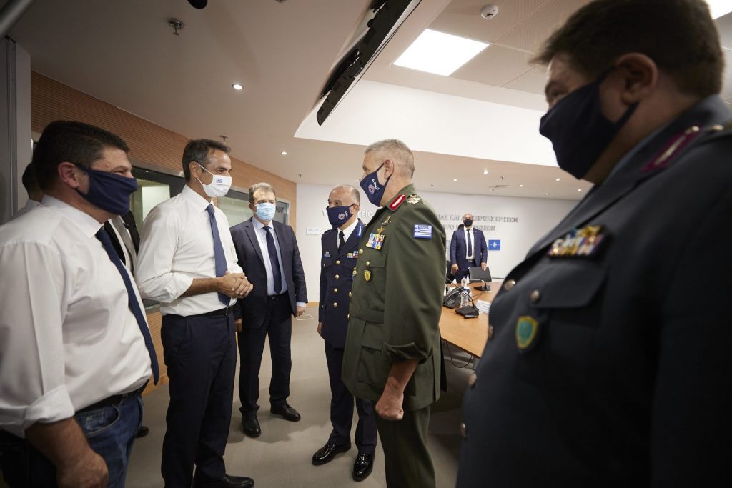 Στη συνέχεια ο Κυριάκος Μητσοτάκης μετέβη στο Ενιαίο Συντονιστικό Κέντρο Επιχειρήσεων και Διαχείρισης Κρίσεων όπου στεγάζονται αμφιθεατρικά στελέχη της Πυροσβεστικής, της Αστυνομίας, των Ενόπλων Δυνάμεων, του Λιμενικού Σώματος και του Ε.Κ.Α.B., ενημερώθηκε για τη λειτουργία του διακλαδικού συντονιστικού κέντρου και τις δράσεις της Πολιτικής Προστασίας ενώ συμμετείχε σε μια σύντομη συνάντηση στην οποία παρουσιάστηκε από τον κ. Χαρδαλιά το πρόγραμμα «ΑΣΠΙΔΑ».