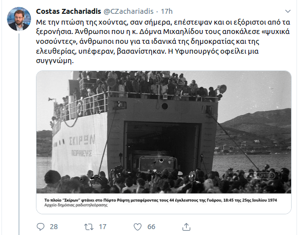 Ωστόσο, τα στελέχη του ΣΥΡΙΖΑ δεν προήθηκαν. Με αφορμή τα 45 χρόνια από την αποκατάσταση της Δημοκρατίας θυμήθηκαν ότι τον Ιούλιο του 1974, πολιτικοί εξόριστοι, βασανισμένοι και εκτοπισμένοι στα ξερονήσια από το καθεστώς της χούντας, επέστρεψαν στο λιμάνι του Πειραιά πνιγμένοι στις αγκαλιές των μανάδων και των συγγενών τους. Στις 25 Ιουλίου 1974, για παράδειγμα, το φέρυ μποτ Σκίρων έδενε στην αποβάθρα του Πόρτο Ράφτη και σαράντα τέσσερις πολιτικοί κρατούμενοι, εξόριστοι στη Γυάρο, αποβιβάστηκαν.