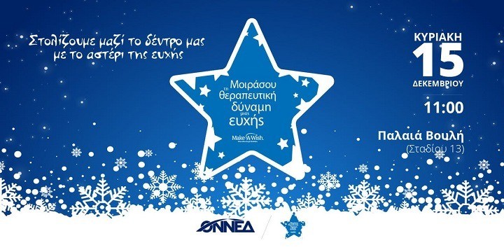 Το χριστουγεννιάτικο δέντρο της Οργάνωσης στο κέντρο της Αθήνας, με τη συνδρομή όλων, θα στολιστεί με «Αστέρια της Ευχής» που το καθένα από αυτά μπορούν να αποτελέσουν ένα ελάχιστο δείγμα αγάπης και συμπαράστασης προς τα παιδιά που στηρίζει το Make-a-Wish και τα οποία πάσχουν από σοβαρές ασθένειες. Με κόστος 2€ για κάθε στολίδι, στηρίζεται ο Οργανισμός και δίνεται η ευκαιρία σε ένα παιδί να δει το όνειρό του να γίνεται πραγματικότητα.