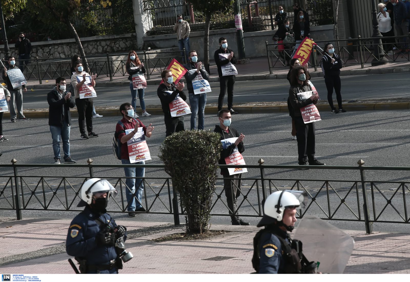 Το πανό στην κεφαλή της πορείας γράφει: “Διεκδικούμε τα δικαιώματά τας σε ζωή, υγεία, δουλειά, τιμάμε τον Νοέμβρη, στον αγώνα”, ενώ οι 200 διαδηλωτές φορούσαν μάσκες και μετα από λίγα λεπτά αποχώρησαν.