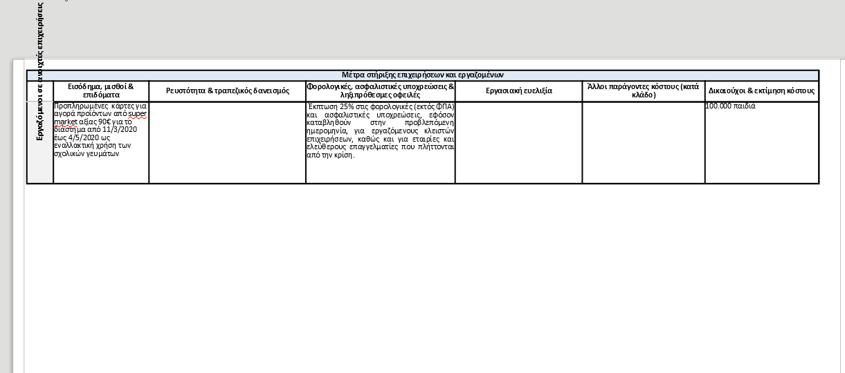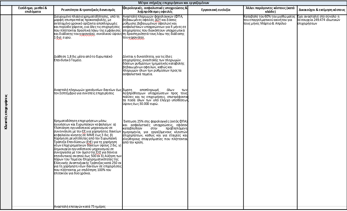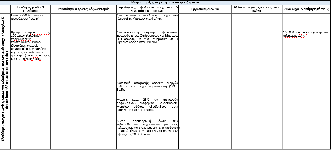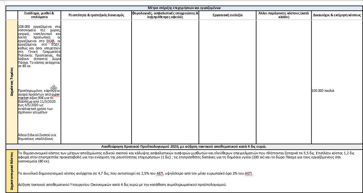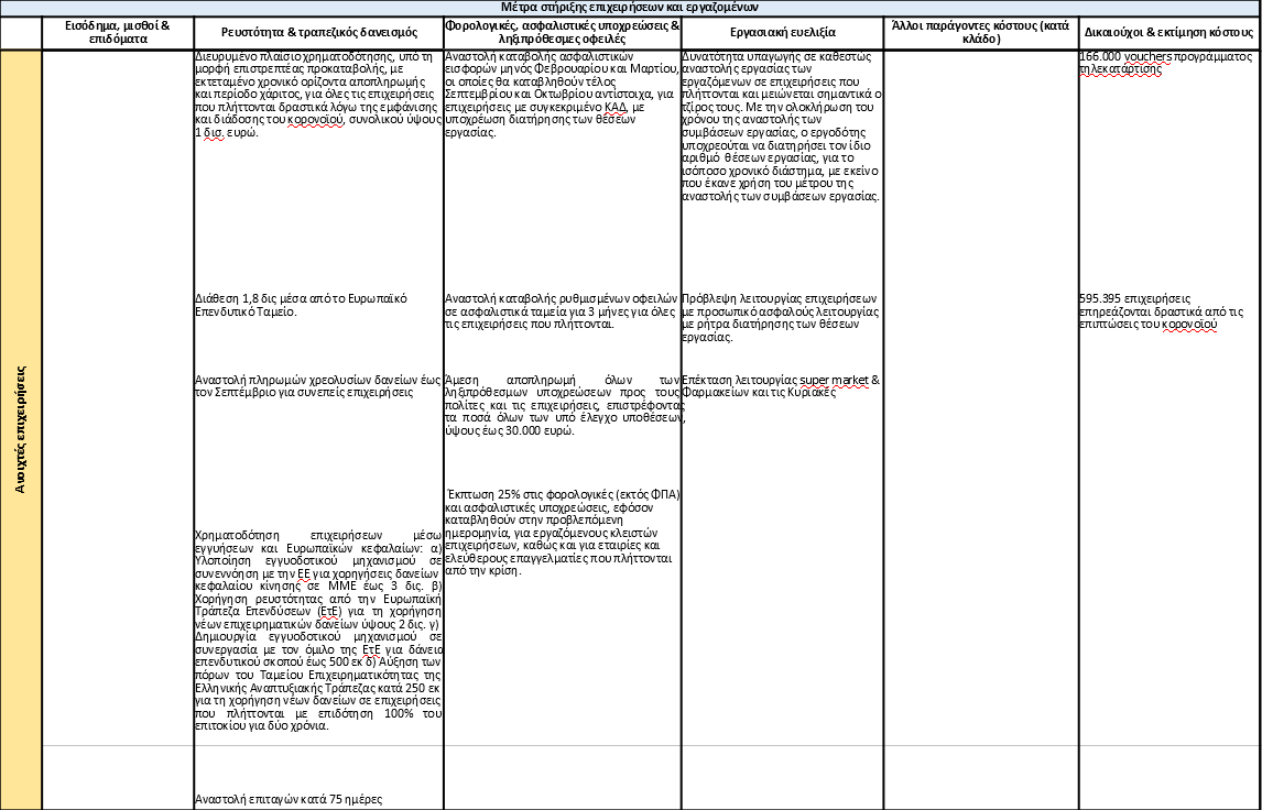 Share Facebook Twitter LinkedIn Pinterest Email Tα μέτρα στήριξης επιχειρήσεων και εργαζομένων που έχει λάβει μέχρι σήμερα η κυβέρνηση Επίσης παρουσιάζει το δημοσιονομικό κόστος το οποίο φτάνει συνολικά τα 4,7 δις ευρώ που αντιστοιχεί στο 2,5% του ΑΕΠ κυβέρνηση Μέτρα στήριξης